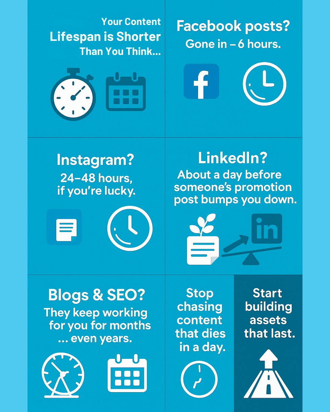 If you’re putting 90% of your marketing energy into posts that disappear in less than 48 hours, you’re trapped in a constant hamster wheel of content creation – with nothing to show for it long-term.